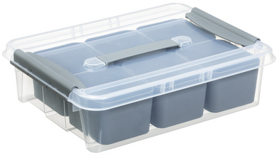 Le Bac de rangement PROBOX DIY est composé d'une boîte transparente et d'un couvercle de couleur gris foncé, vous permettant de visualiser rapidement et aisément le contenu de chaque compartiment. Grâce à ses clips gris, le couvercle se ferme de manière sûre et sécurisée, assurant ainsi la protection de vos fournitures de bureau et autres objets.