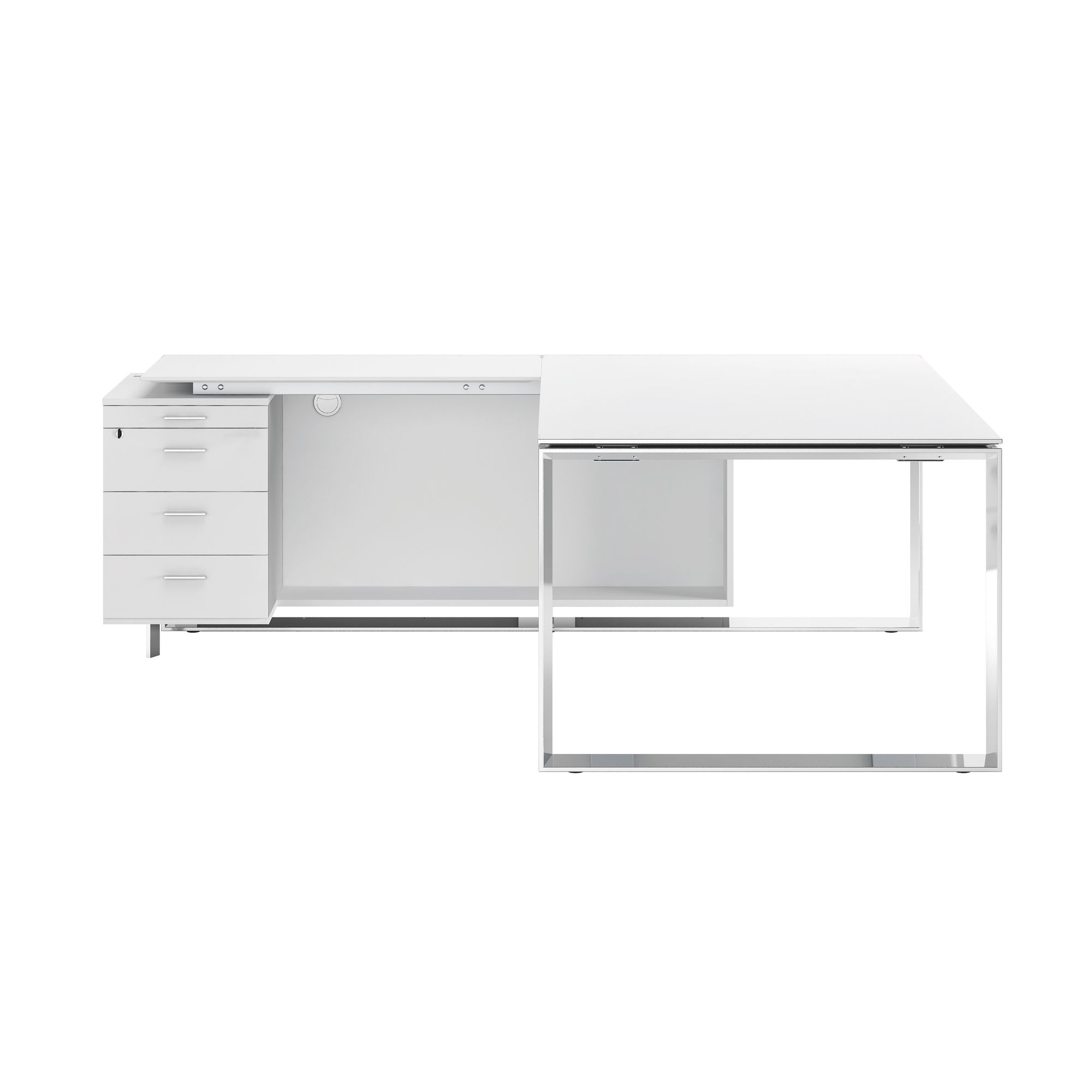 Schreibtisch mit tragendem Schrankteil : enthält 4 Schubladen mit Griffen aus verchromtem Metall, davon 3 für die Aufbewahrung und 1 Stifteinsatz. Das zentrale Verriegelungssystem per Schlüssel gewährleistet die Sicherheit Ihrer Dokumente.