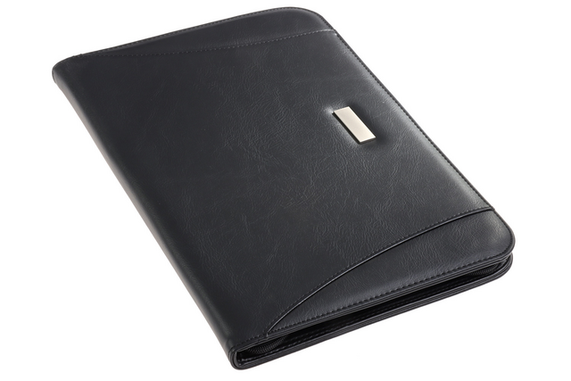 * Conférencier Excellent de Luxe réalisé en similicuir. * Sur l’intérieur gauche, plusieurs pochettes dont une à fermeture éclair pour documents A4 et cartes de visite. * Une pocherchette se ferme par un zip. * Au milieu, porte-stylo. * Sur l’intérieur droit, bloc-notes de 50 feuilles lignées. * Fermeture éclair tout autour. * Plaquette métallique à l’extérieur pour la gravure d’un nom ou logo. * Couleur noir.