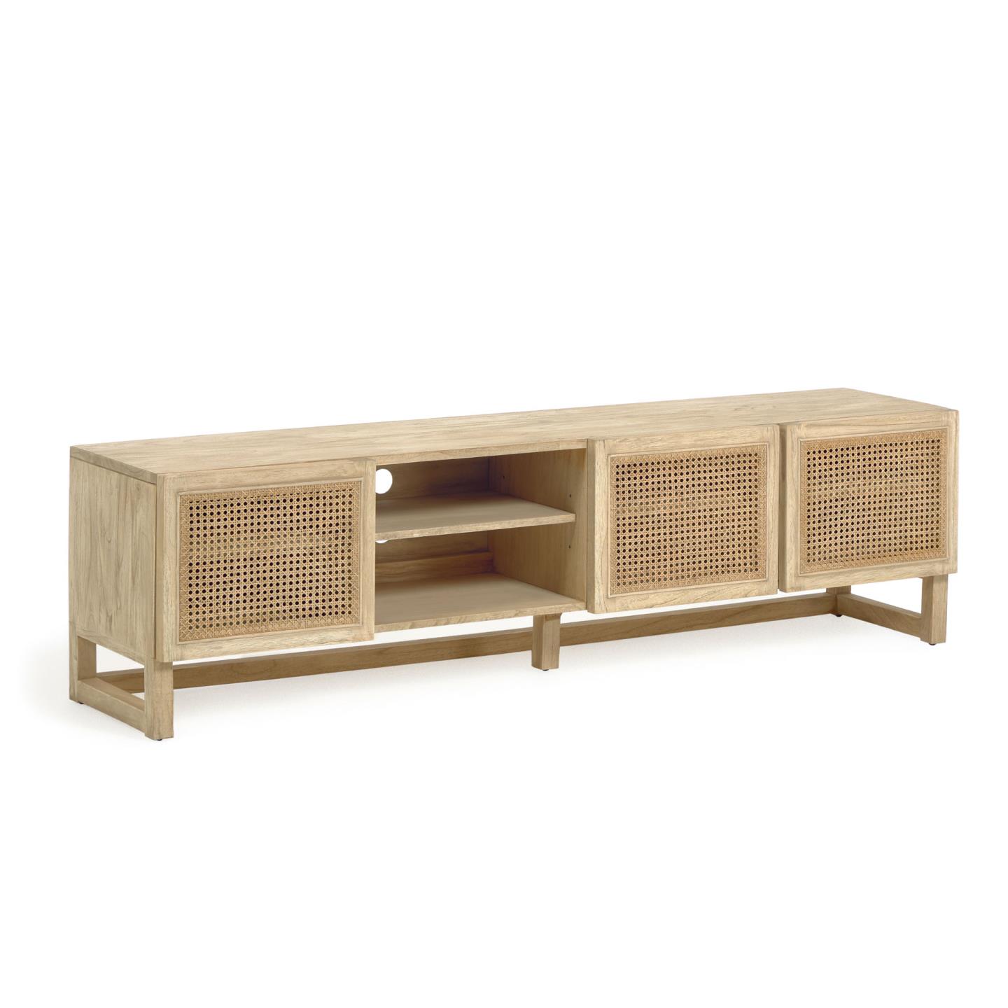 Pour un look naturel et tendance, osez Rexit. Il est conçu en contreplaqué et bois massif de mindi écoresponsable avec devant en rotin tressé à la main. Une pièce qui vous offre plus de place de rangement et qui vous facilite l'entretien du sol.- Meuble TV en bois massif et contreplaqué de mindi, aux tons et veinures uniques, avec devant en rotin tressé à la main.