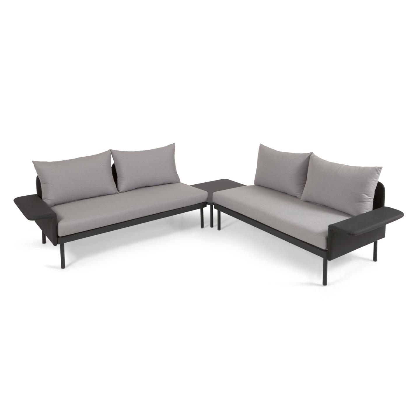 • Canapé d'angle modulable avec table d'appoint. Fait en aluminium 100% adapté pour les espaces extérieurs couverts.