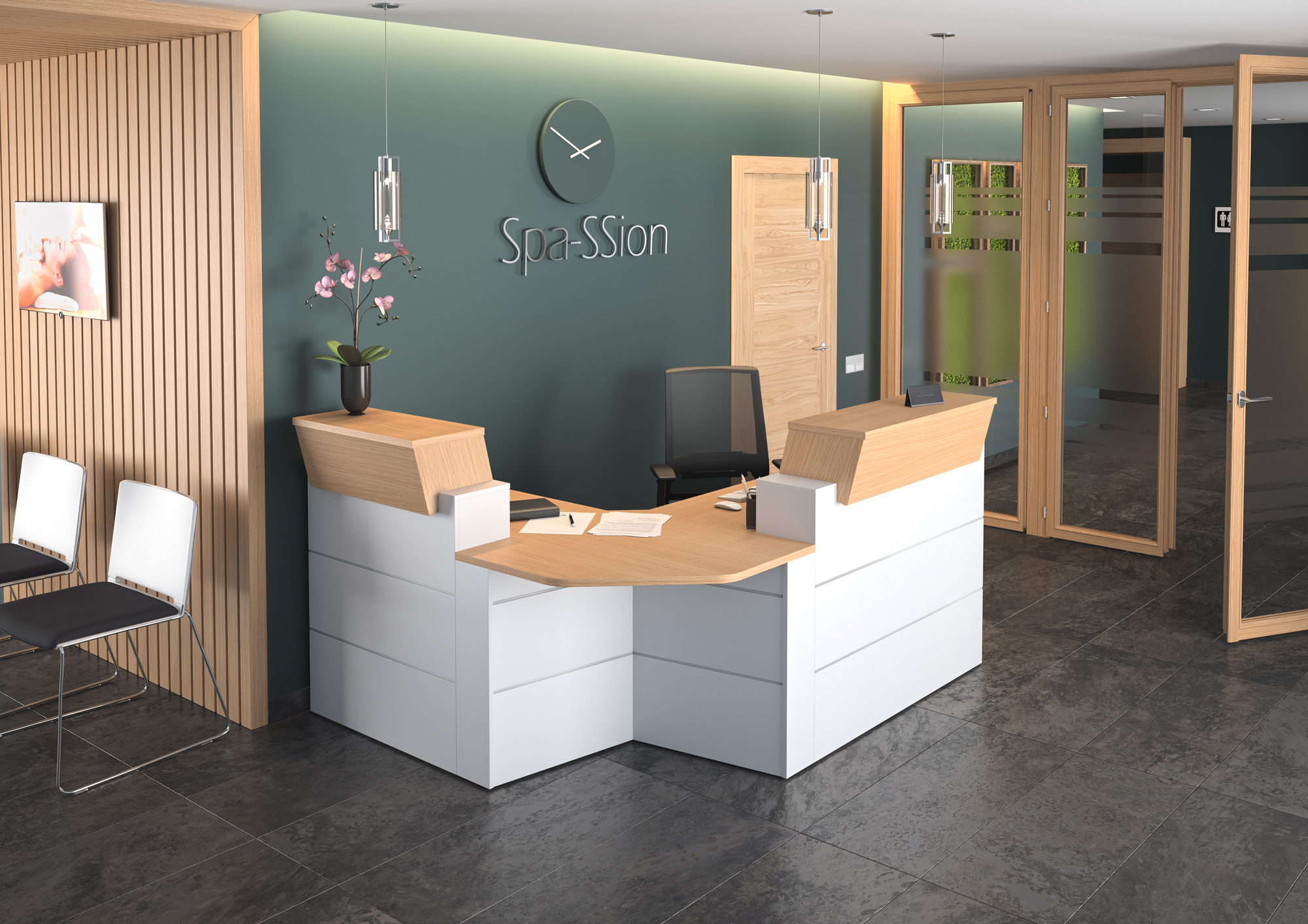 Sie können Ihre Arbeitsfläche mit der Eckempfangstheke für Personen mit eingeschränkter Mobilität optimieren. Dieses Möbelstück ist aus 25 mm starken, melaminbeschichteten Spanplatten mit 2 mm ABS-Kanten gefertigt. Dieser praktische und designorientierte Empfangsmöbel ist mit einem 90°-Winkel, einer Eichen-Dekorplatte und einem Korpus in weiß mit 2 Aluminiumstreifen ausgestattet.