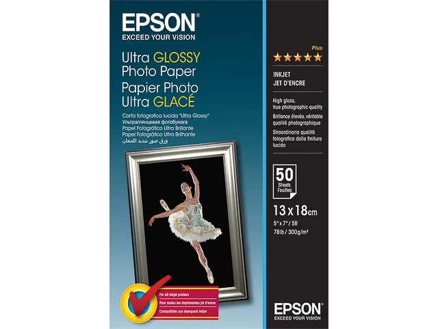 Epson Ultra Glossy Photo Paper - Glänzend - 130 x 180 mm 50 Blatt Fotopapier - für EcoTank ET-1810, 2810, 2811, 2814, 2815, 2820, 2825, 2826, 2850, 2851, 2856, 4800, 4850. Wie hoch Ihre Ansprüche auch sein mögen, die Medienpalette von Epson erfüllt alle Wünsche. Von hochglänzend bis matt verfügen die Epson Medien eine Vielzahl verschiedener Oberflächenbeschaffenheiten und Größen. Das Angebot an Fotomedien liefert die perfekte Grundlage für brillante Ausdrucke.