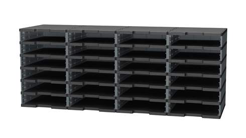 Modular, für eine effektive Organisation Ihrer Dokumente. 24 Fächer mit Standard-Format: H 8,9 x B 28,8 x T 35,4 cm. Nutzdimensionen eines Faches: H 5,9 x B 25,6 x T 34 cm. 2 mögliche Einteilungen: 3 Spalten mit 8 Fächern oder 4 Spalten mit 6 Fächern. Für Dokumente bis Format 24 x 32 cm. Sehr stark: Tragkraft bis 72 kg. Est ist möglich, Schubladen hinzuzufügen, um die Vertraulichkeit der Dokumente zu garantieren (optional). Sie können auch die schwarzen Schubladen (optional) gegen die gefärbten Vorderseiten (optional) eintauschen, für eine einfachere Identifizierung der Dokumente. Außenabmessungen: -Einteilung mit 3 Spalten von 8 Fächern: H 62 x B 86,4 x T 35,4 cm. -Einteilung mit 4 Spalten von 6 Fächern: H 46,5 x B 115,2 x T 35,4 cm. In recycelbarem Plastik-Polystyrol, mit Ange Blue-Zertifizierung. Außenseite in grau, Innenseite in schwarz. Schon montiert.