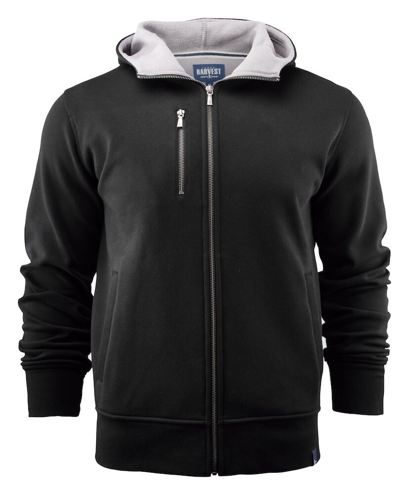 Kapuzenjacke aus Doubleface-Material, Baumwolle außen und Fleece innen. Metallreißverschlüsse vorne und an der Brusttasche. Rippenbündchen am Bund und an den Ärmeln.