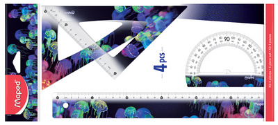 Detaillierte BeschreibungEn plastique, avec motif méduses,contenu: règle 300 mm, équerre 60 degrés 210 mm,équerre 45 degrés 210 mm, rapporteur 180 degrés 120 mm