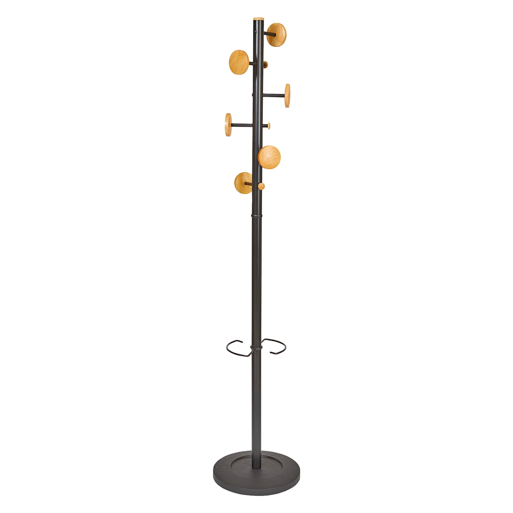Es besteht aus 6 Haken und 3 Mini-Haken zum Aufhängen Ihrer Kleidung und Accessoires, einem Regenschirmständer mit einer Kapazität von 6 Regenschirmen und einem beschwerten Fuß für optimale Stabilität (5 kg).
