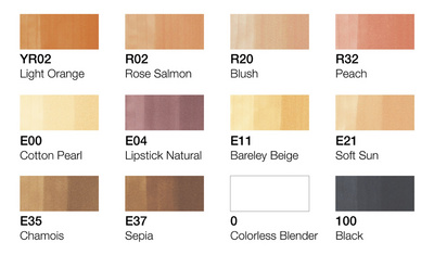 Le corps gris clair des marqueurs offre une prise en main confortable et une utilisation aisée, tandis que la largeur du tracé de 3,0 mm permet de réaliser des traits précis et nets. Les couleurs assorties incluent les références E00, E04, E11, E21, E35, E37, R02, R20, R32, YR02, 0 et 100, offrant une grande variété de teintes à votre disposition.