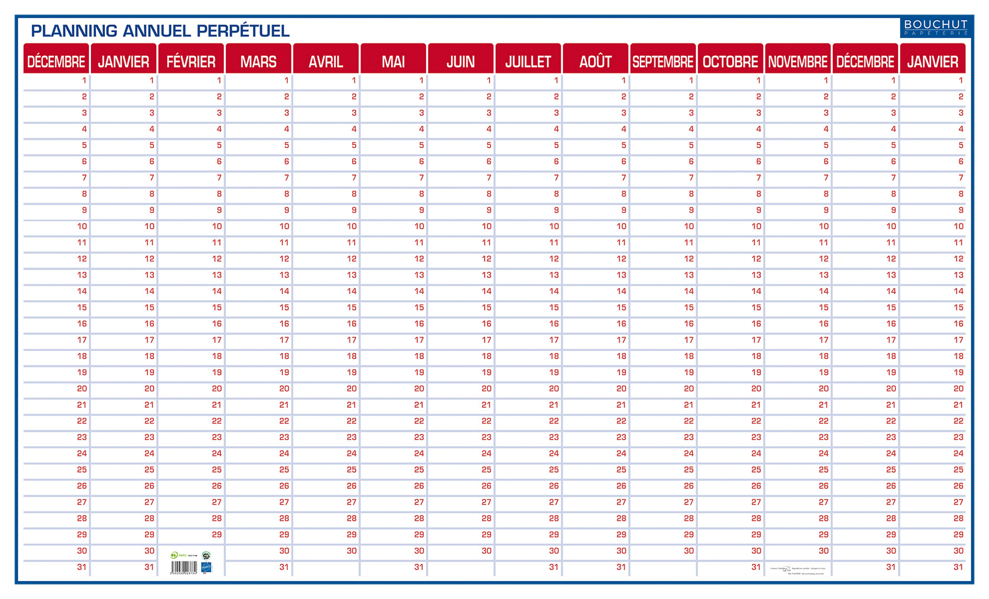 Entdecken Sie unseren jährlichen trocken abwischbaren ewigen Kalender in der Größe von 60 x 99 cm! Mit einer Dauer von 14 Monaten von Dezember bis Januar ist dieser praktische und wiederverwendbare Kalender perfekt, um die Aktivitäten Ihrer ganzen Familie zu organisieren. Die roten und blauen Farbtöne bringen Farbe in Ihr Zuhause und erleichtern das Lesen. Mit genügend Platz, um alle Ihre Ereignisse, Termine und Aktivitäten hinzuzufügen, ist dieser Kalender auch abwischbar, sodass Sie ihn unendlich oft verwenden können, ohne jedes Jahr einen neuen kaufen zu müssen. Entscheiden Sie sich jetzt für Nachhaltigkeit mit unserem ewigen jährlichen Kalender!