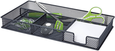 Detaillierte BeschreibungFil métallique thermolaqué, avec 4 compartiments différents: 2 cases de rangement, une longue case & 1 case carrée pour un bloc de note 90 x 90 mm, livré dans une boîte transparente, dimensions: (L)290 x (T)160 x (H)40 mm.