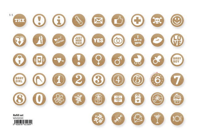 Detaillierte Beschreibung* Ce set de recharge Mini Woodies contient pas moins de 250 petits tampons. * 50 motifs différents disponibles. * Chaque tampons a un diamètre de 15mm.