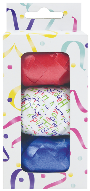 * Ruban cadeau polyvalent disponible en 3 superbes couleurs. * Il transforme votre cadeau en un présent impressionnant. * Contenu : rouleau rouge, bleu et avec le texte « Happy Birthday ». * Par rouleau : 10mx5mm.