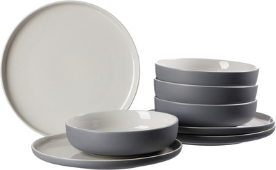 Detaillierte BeschreibungEn grès, l'intérieur et le dessus sont recouverts d'un émail brillant, l'extérieur et le dessous d'un émail mat, avec toucher soft-touch chaud et rugueux contenu: 4 assiettes plates, 4 assiettes creuses