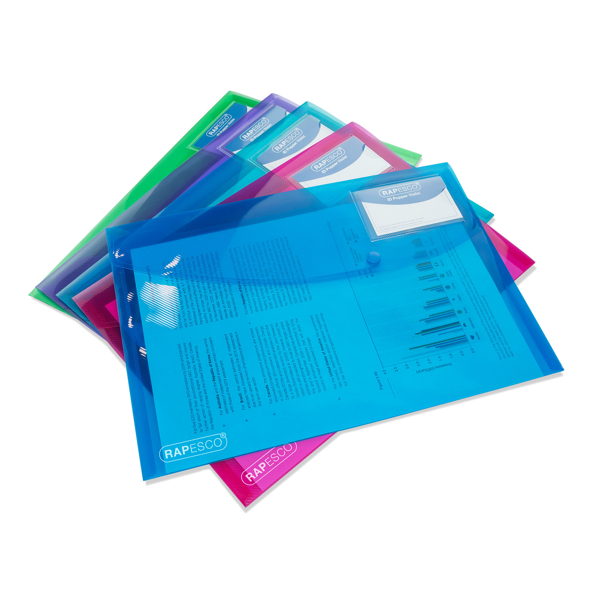 Detaillierte BeschreibungKnopfverschluss-Mappe/ Dokumentenhalter für Format A4.Flap-Button-Verschluss zum Sichern Ihres InhaltsHohe Kapazität bis zu 150 BlätterStiftverlängerung auf der Seite der MappeKartenhalter an der Vorderseite der Mappe5 transparente Farben: blau, rosa, türkis, lila und grün