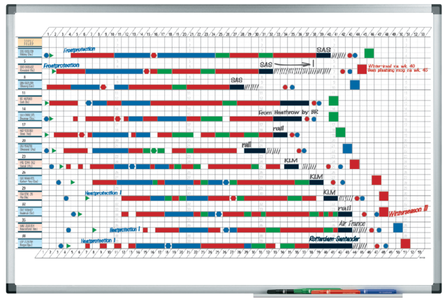* Tableau de planning magnétique sur lequel on peut écrire comme sur un tableau blanc. * Idéal pour le planning annuel ou projets. * Dimensions d'une case : 11x15mm. * Colonnes : 11x60mm. * Avec un cadre en aluminium anodisé. * Avec auget, set accessoires et matériel de fixation inclus. * Le set accessoires comprend le TZ 111 / jeu de 4 marqueurs et 40 porte-étiquettes (10x60mm) avec étiquettes à insérer blanches.