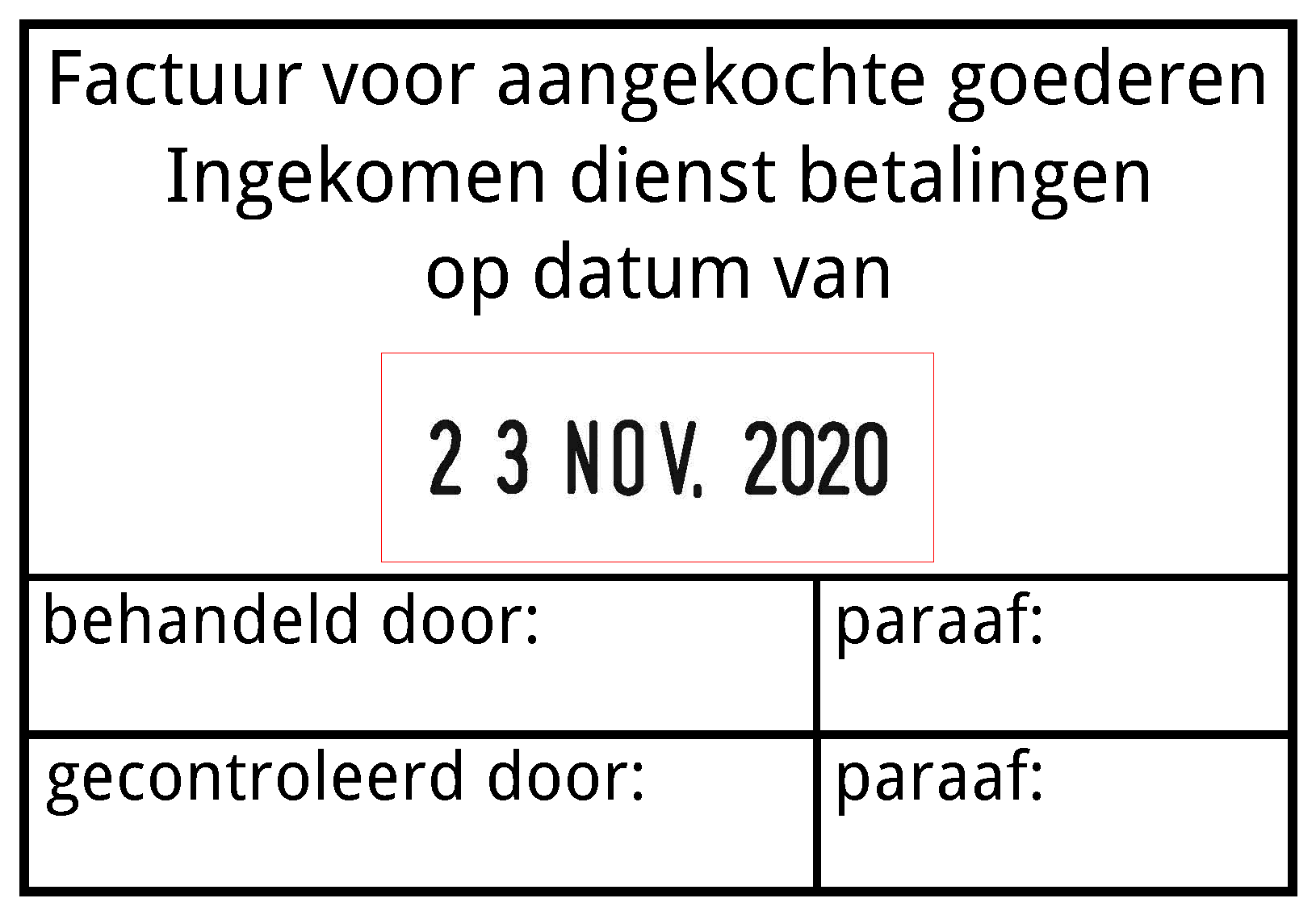 Detaillierte BeschreibungAbdruckgröße: 67 x 47 mm, max. 10 Zeilen, Schrifthöhe Datum: 4mm. Tinten in verschiedenen Farben.
