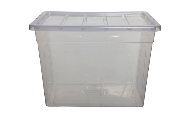 Boîte de rangement en plastique solide et transparent 100% sans BPA (Bisphénol). Avec couvercle, protégeant ainsi le contenu contre la poussière et la saleté. Parfaitement empilable, avec ou sans couvercle. Idéale pour le rangement des documents ft A4, outils generaux de la maison, d'accessoires de bureau, etc. Paquet de 3 pieces.