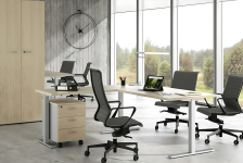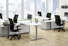 The desks are equipped with a side shelf for your IT equipment and an integrated drawer unit to keep your files within easy reach. With T-shaped legs in aluminium finish, they combine stability and modernity, while matching the tops available in white or light oak.
