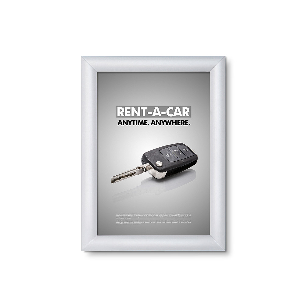 Promote your products or brand with the stylish and sturdy 20 mm Snap Frame Slim. This is a premium aluminum snap frame featuring a 20 mm wide profile. Easily and swiftly swap out your poster display without removing the frame from the wall, thanks to its convenient snap frame design. Choose between mitred or rounded corners to suit your preference. An ideal advertising solution for smaller posters ranging from A5 to 70 x 100 cm. Perfect for sharing information or advertising in the hospitality industry, retail environments, and public areas, or use it as wall art for home decoration.