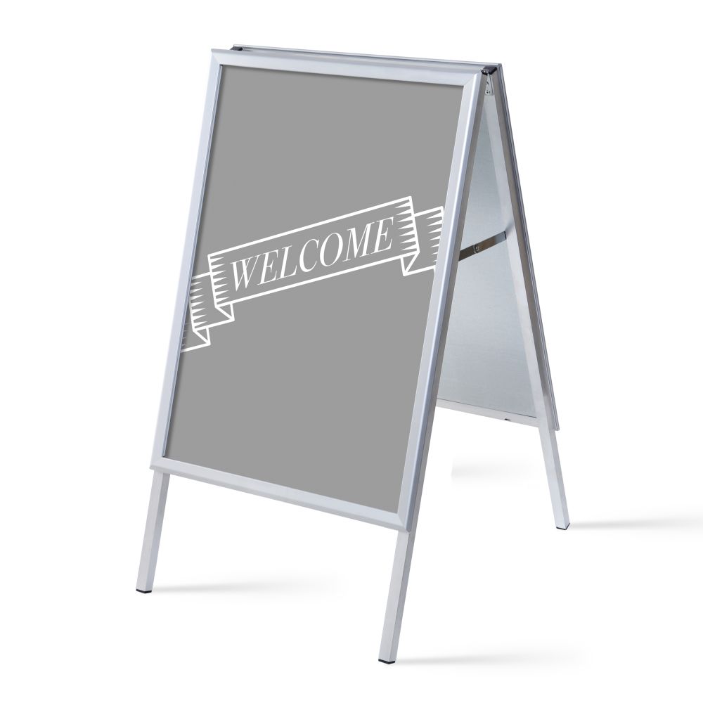 Greet guests with a 'Welcome' display. Ideal for use in sheltered public spaces, hospitals, malls, or at exhibitions and events. This straightforward, practical, and attention-grabbing advertising solution features an A-Board made of aluminum, designed in an 'A' shape. Its 32 mm thick profile ensures it's strong, rust-resistant, and stable. It's perfect for indoor environments and covered outdoor settings, available in A1 size. A fantastic method to draw in casual passersby.