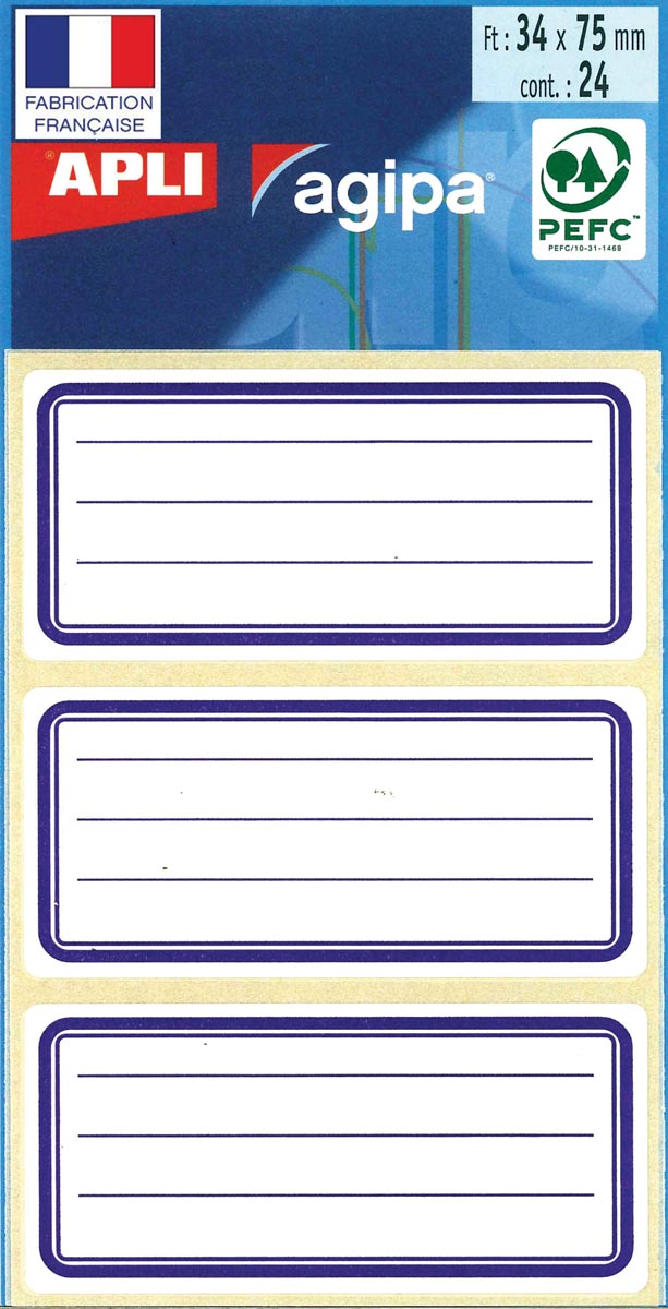 Agipa étiquettes écoliers ft 75 x 34 mm (l x h), 24 étiquettes par étui, bord bleu, ligné