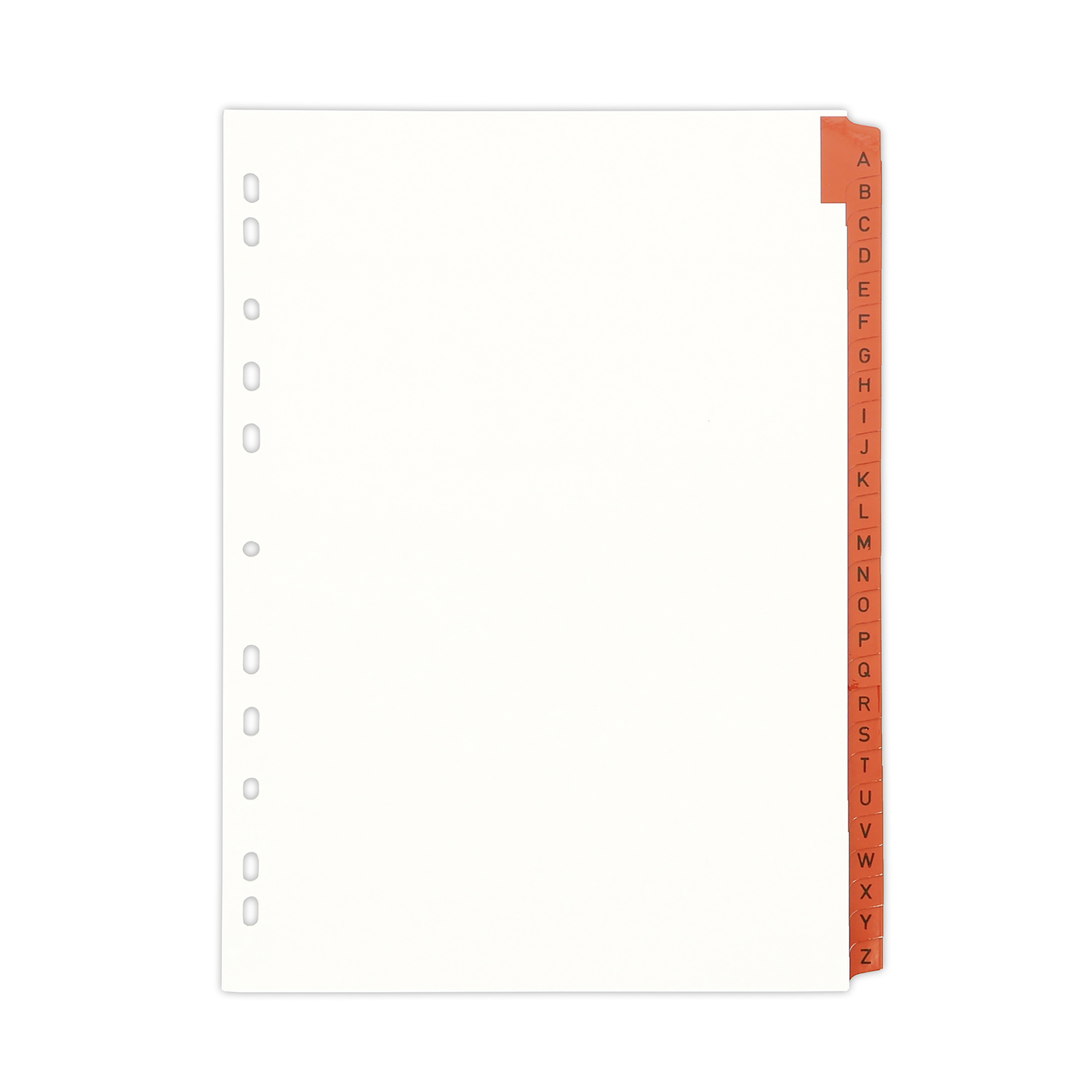Detailled descriptionUniversal perforation. Fits in all folders. Bristol 170 g, Mylar tabs, 26 red / brown devisions printed on the front. For size A4 (21 x 29,7 cm).