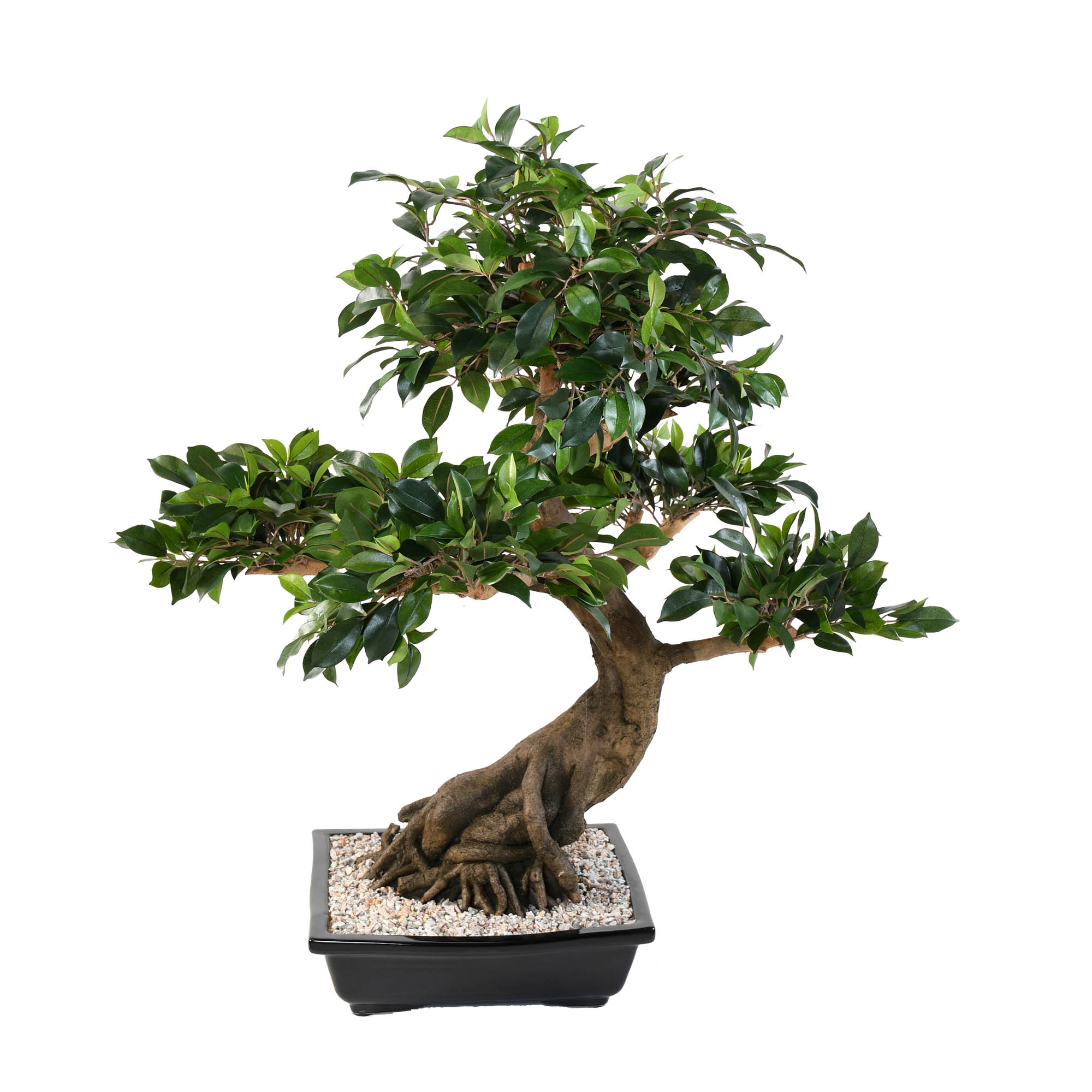 Bonsaï Ficus artificiel 78cm, présenté dans une coupe (35cm*27cm), surfaçage gravier,