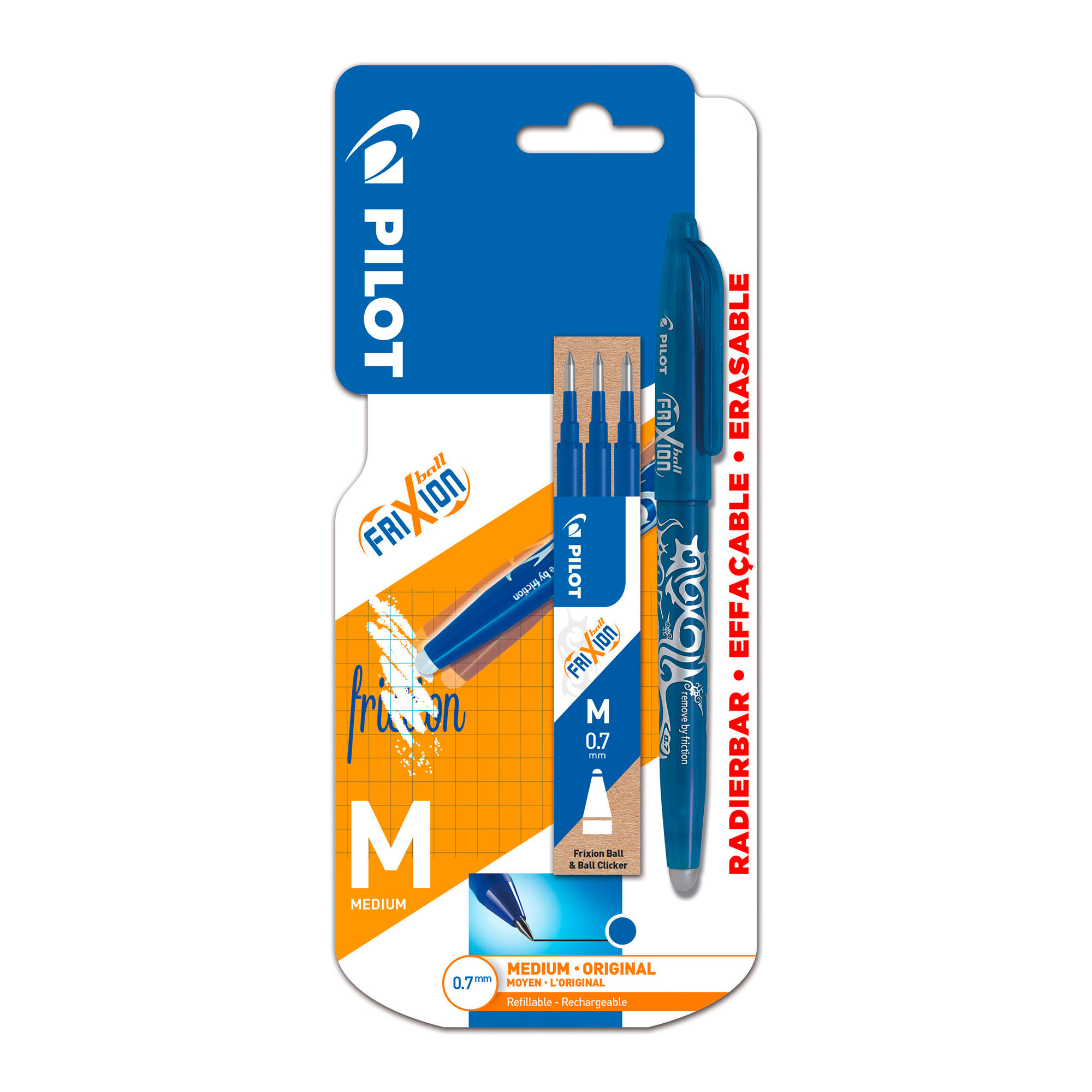 Write smoothly with the medium-tip FriXion Ball, erase by heating with the FriXion eraser without damaging the paper and rewrite immediately. Thanks to a new patented heat-sensitive ink, PILOT has - true to tradition - revolutionised writing with the FriXion Ball. It displays a youthful style with its streamlined body and its tattoo decoration. Not to be used on official documents.1 x Set of 3 - FriXion pen refill - Ball 0.7 - Blue - Medium Tip