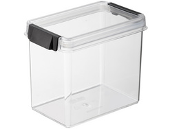 Detailled descriptionRectangulaire, transparent/noir, en SAN/silicone, à usagealimentaire, couvercle hermétique à clip, couvercle & fondtransparents, clip noir, empilable,dimensions: (L)168 x (P)109 x (H)145 mm