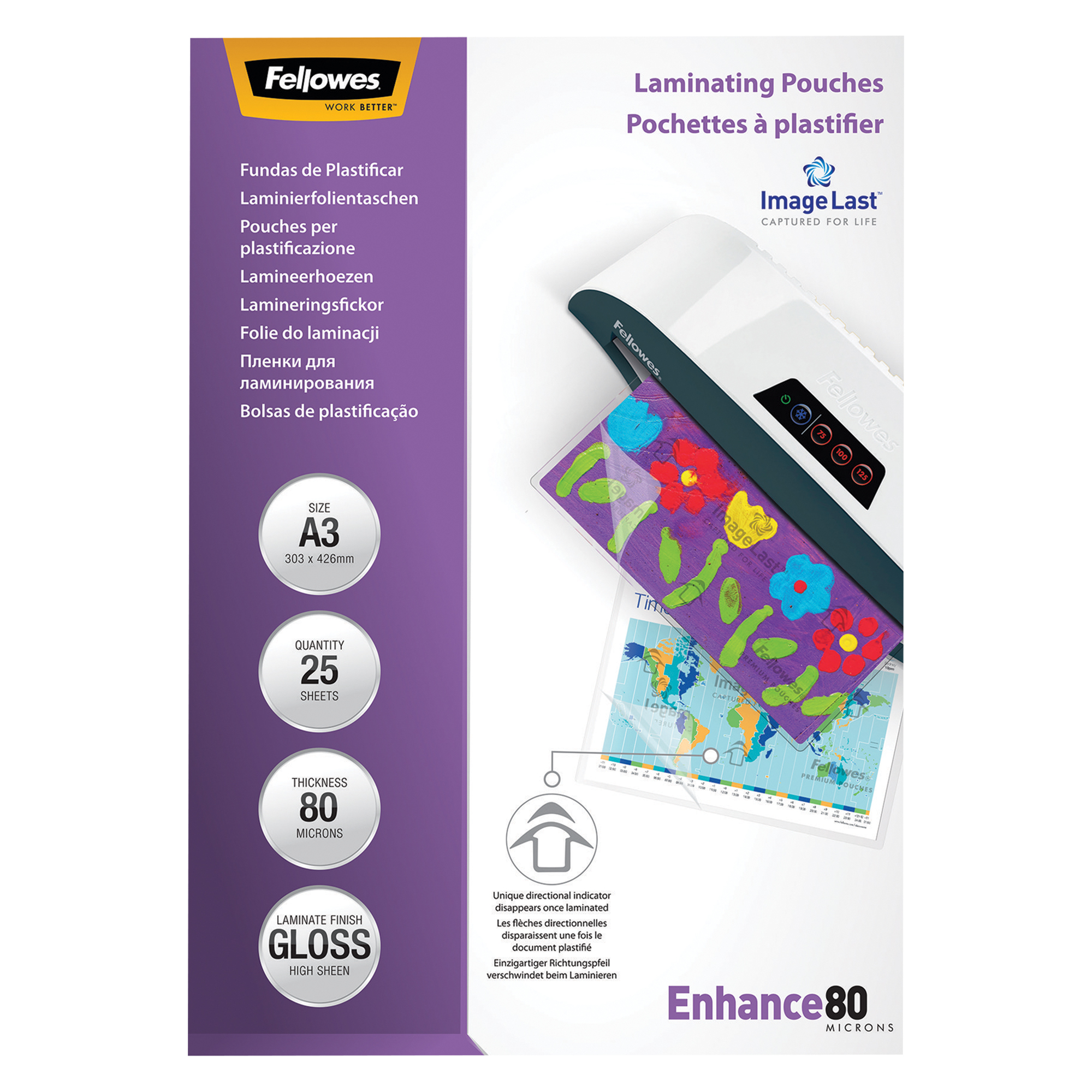 Detailled descriptionTransparent, shiny appearance. The arrow indicating the correct direction for inserting the pouch disappears once the plastic document is laminated.A3 size, thickness 2 x 80 µpack of 25 laminating pouches.