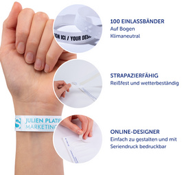 Bracelets imprimables. Parfaits pour les soirées d'entreprise, réunions, séminaires et événements. Grâce à leur matière douce pour la peau et aux bords lisses, ces bracelets sont agréables à porter. Et ils résistent à l'eau et aux salissures. Inviolable: le bracelet se retire facilement du poignet grâce à une ligne de microperforation mais ne peut pas être réutilisé. Faciles à créer et imprimer avec notre logiciel gratuit Avery Desing & Print. Taille du bracelet: 1,8 x 26,5 cm. Paquet de 10 feuilles avec 10bracelets (100 bandes au total).