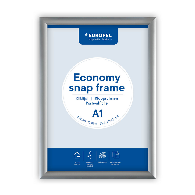 * Le cadre clipsable Europel Economy pour posters A1 est une solution raffinée grâce à notre système Easy-Click rapide pour l'efficacité et l'élégance! * Ce cadre clipsable au design épuré permet d'accorder à vos affiches et messages l'attention qu'ils méritent. * Fabriqué en aluminium durable et doté du système innovant Easy-Click, ce cadre vous permet de présenter votre contenu rapidement, sans effort et de manière attrayante. * Cadre élégant en aluminium : avec un angle vif et coupé en biseau pour un look moderne et professionnel. * Système Easy-Click : Fixez vos affiches rapidement et facilement, pour une présentation accrocheuse pour attirer immédiatement l'attention. * Construction robuste : fabriqué en aluminium de haute qualité, le cadre clipsable offre une longue durée de vie et un look chic. * Film frontal non réfléchissant : protège contre la saleté et l'humidité tout en garantissant un affichage clair et net de vos informations. * Format idéal : convient au format A1 (59,4x84cm), suffisamment polyvalent pour toutes sortes de présentations. * Autres formats : Les cadres clipsable Economy sont disponibles dans les formats A0, A1, A2, A3, A4, A5, B1 et B2. * Design fin : le profil de 25mm d'épaisseur apporte une touche minimaliste et permet de garder l'attention sur le contenu de la présentation. * Montage flexible : facile à placer horizontalement ou verticalement, il s'adapte à toutes les pièces et à tous les environnements. * Matériel de montage inclus : Fourni avec toutes les vis et chevilles nécessaires pour un montage sûr. * Augmentez le professionnalisme de vos présentations avec notre cadre clipsable Europel Economy.