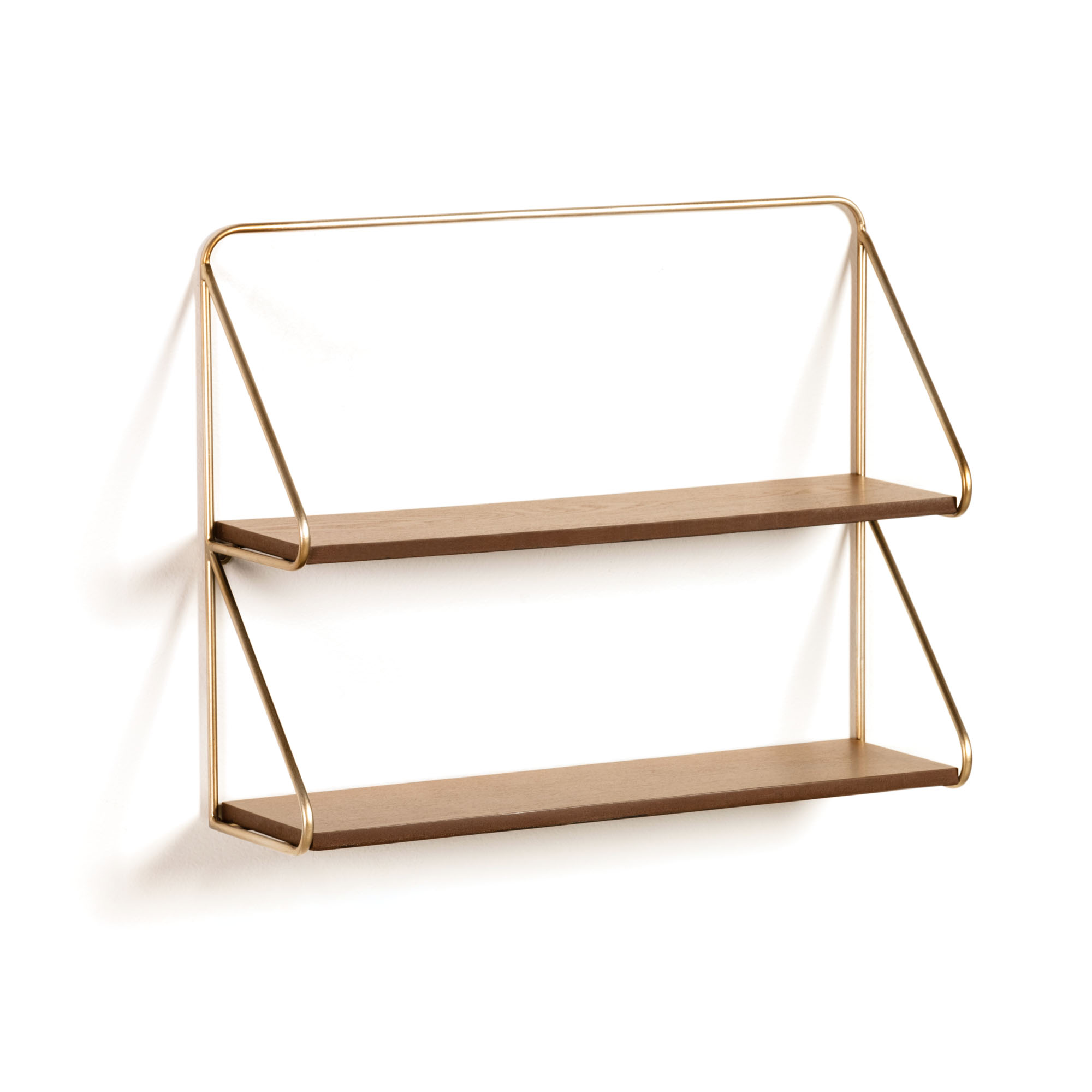 The Catrina shelving unit has two wooden shelves set into a metal structure with a gold finish. This is a piece with simple lines that create a light and airy look. In addition, it is structured so that books are able to stand up. Design is also smart.
