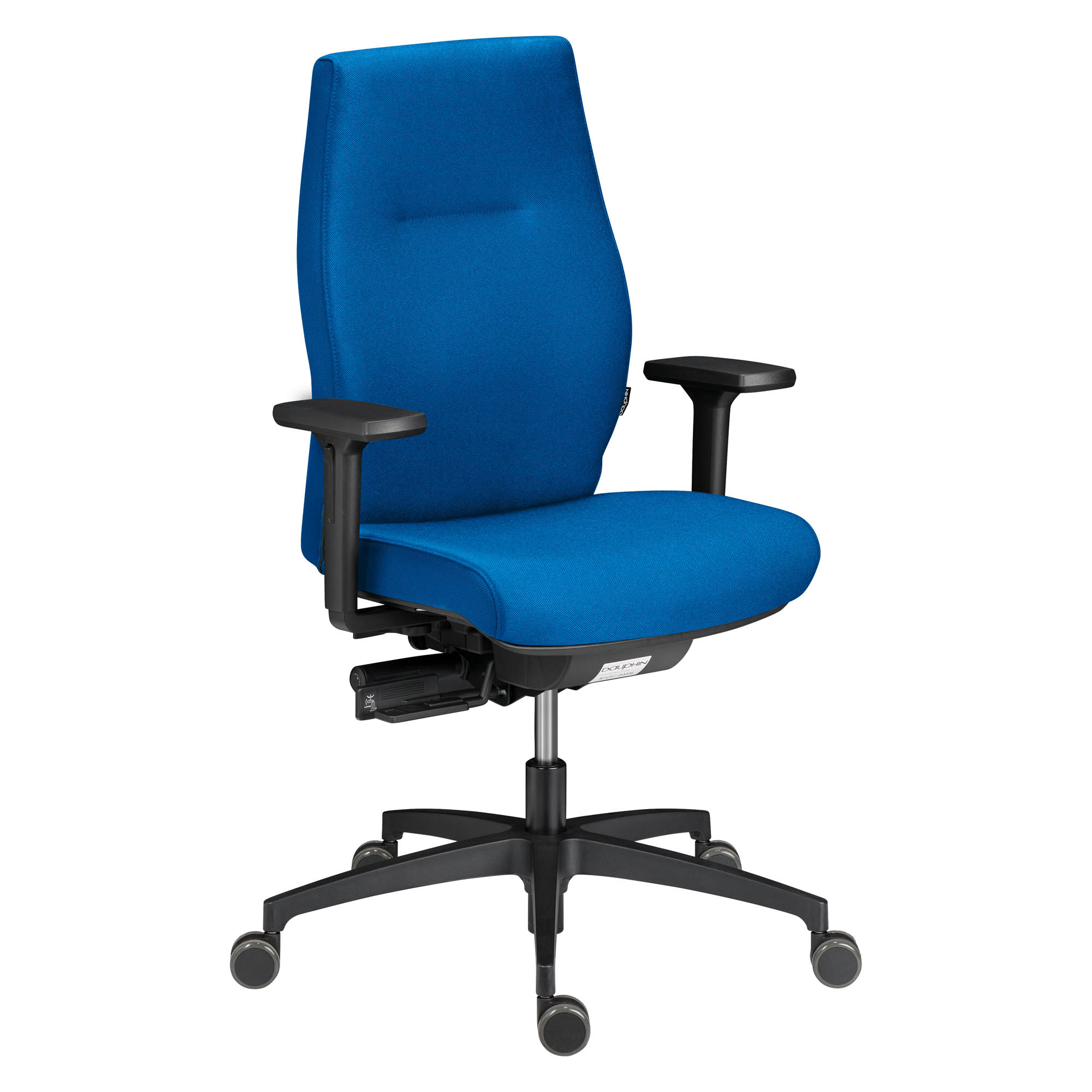 Material: fully upholstered backrest and seat 100% polyester M1. Lumbar support is adaptable in height by 8 cm. 2D armrests in black polyamide with flexible covering in polyurethane. Black undercarriage in reinforced polyamide with self-blocking double-wheeled castors Ø 60 mm.