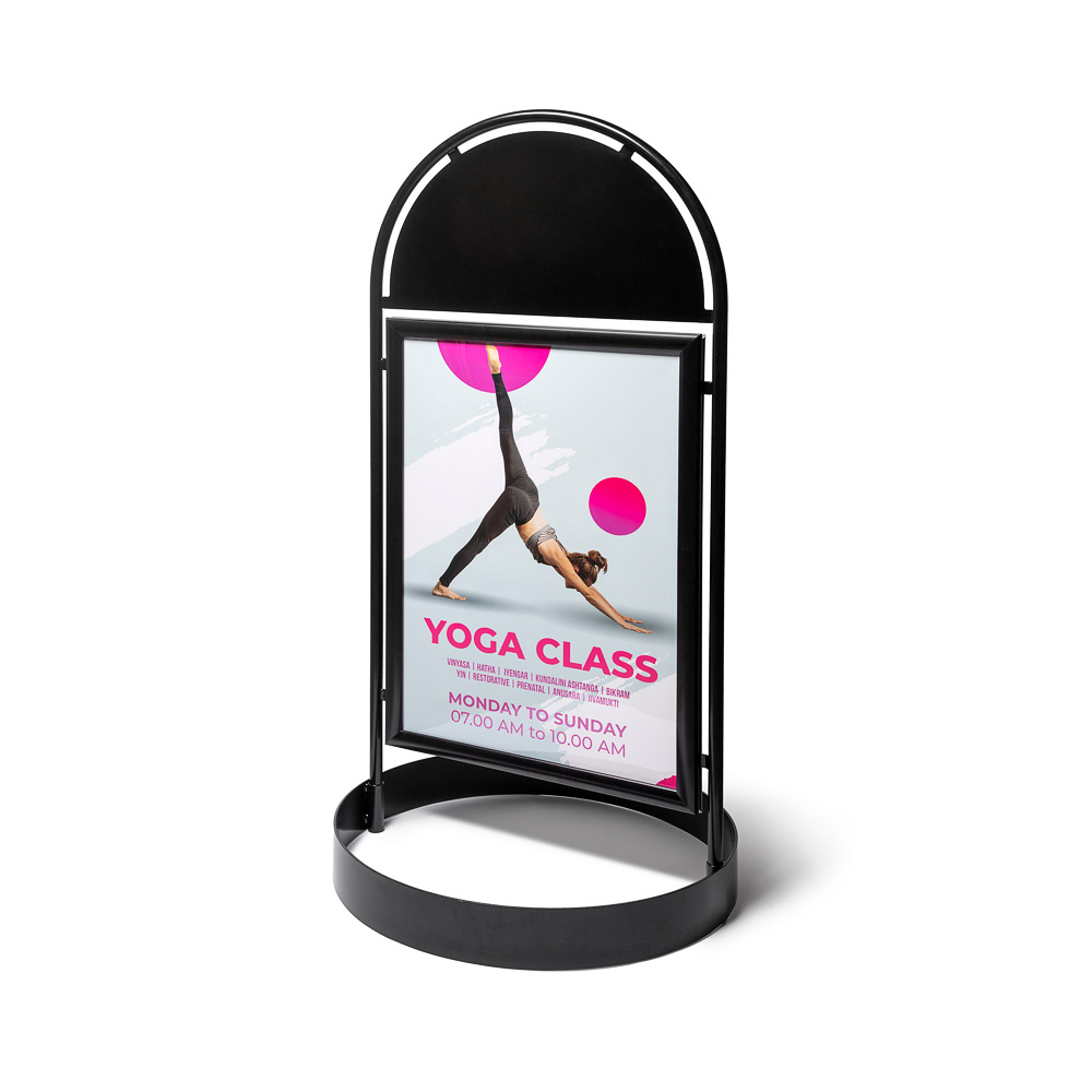 Engineered for urban environments, this double-sided outdoor sign ensures stability, safety, and long-lasting performance. Its circular steel base enhances sidewalk safety, while the powder-coated frame offers robust weather resistance. The elegantly rounded top is an ideal space for your branding needs. Easily update your messaging with the snap-profile system, ensuring your promotions remain fresh and relevant. The UV-stable, anti-glare protective foil guarantees clear visibility and prolonged protection for your printed content. Suitable for standard A1 and 50 x 70 cm formats, this sign is exclusively available in a sleek black finish. An excellent choice for businesses seeking effective and durable outdoor advertising solutions.