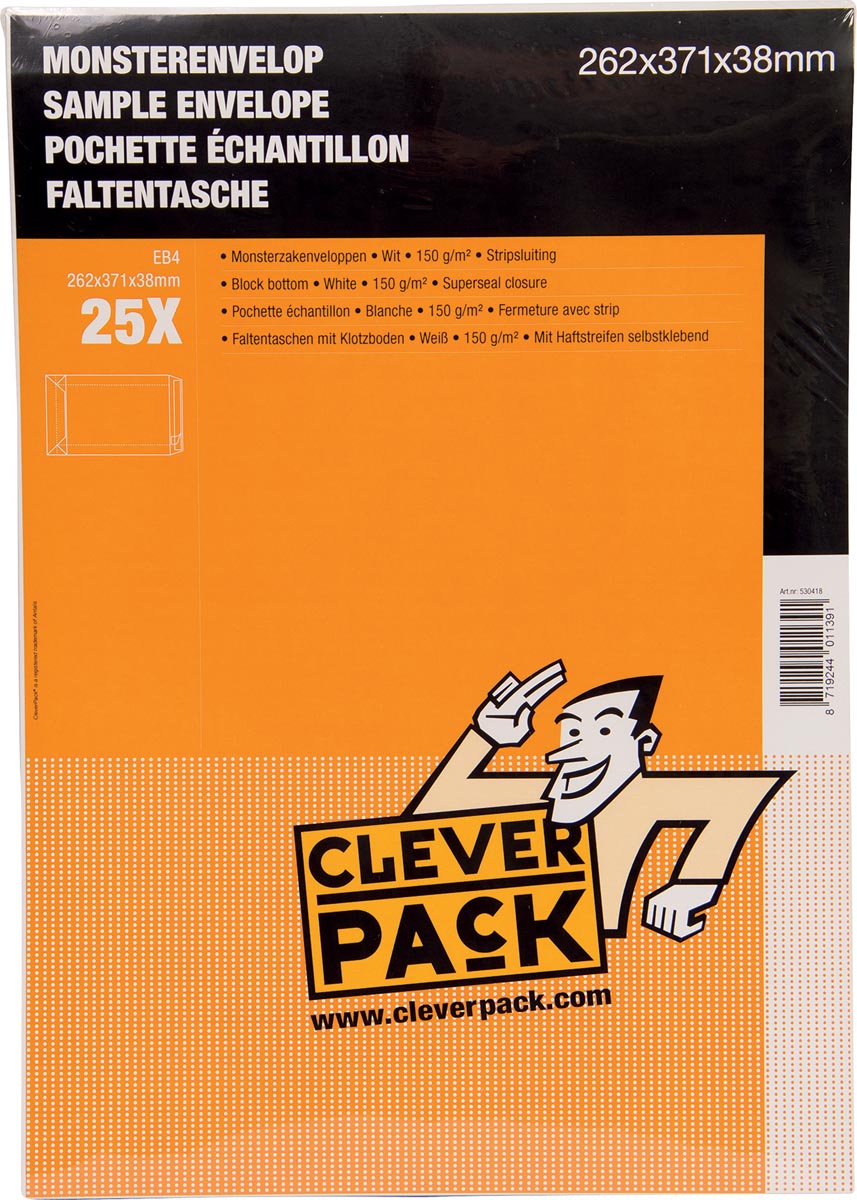 Cleverpack pochettes échantillons, ft 262 x 371 x 38 mm, avec bande adhésive, blanc, paquet de 25 pièces
