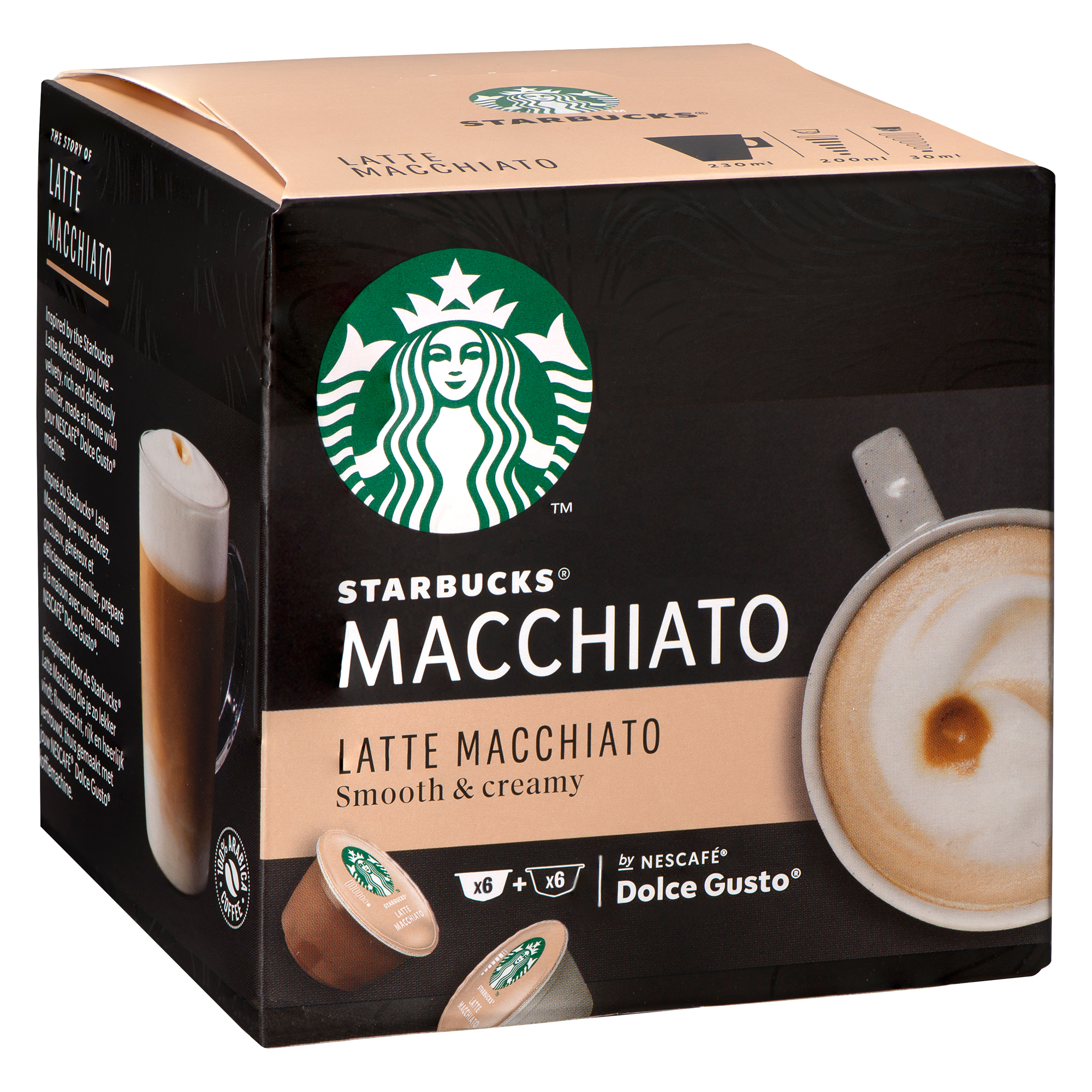 Detailled descriptionDiscover the creamy STARBUCKS® latte macchiato with hot milk, espresso, and a generous milk foamAromatic coffee and creamy foamLatte Macchiato2 boxes of 12 Dolce Gusto capsules (1 box of 12 capsules corresponds to 6 coffee pods and 6 milk capsules, making 6 drinks).Compatible with all Dolce Gusto capsule coffee machines sold by Bruneau.