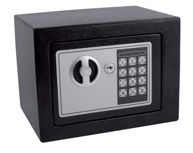 * Le mini coffre-fort Pavo électronique est idéal pour une utilisation personnelle. * La serrure électronique à combinaison est simple à programmer avec un code personnel de 3 à 8 chiffres. * Si vous oubliez le code d’accès, vous pouvez ouvrir le coffre avec une clé de secours. * Système sécurisé de verrouillage automatique dans les 20 secondes après 3 essais avec une mauvaise combinaison. * Affichage LED pour entrer la saisie de la combinaison et le statut des piles.* Le coffre-fort peut être fixé en toute sécurité au mur ou sur le sol. * Dimensions coffre-fort 230x170x170mm – 6,6 L. * Porte à double-paroi d’une épaisseur de 3mm et un corps de 2mm. * Inclus 2 clés de secours et matériel de fixation. * Alimentation 4 piles AA (non fournies). * Matériau: acier. * Couleur: noir.