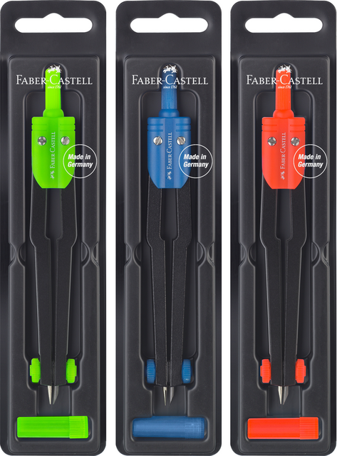 * Qualité et fonctionnalité associées au design - telle est la devise de l'entreprise Faber-Castell. * Mais en plus des designs tendance, Faber-Castell propose également une technologie robuste. * Ce compas est idéal pour une utilisation scolaire et réalise des cercles d'un diamètre allant jusqu'à 360mm. * L'ensemble est livré dans une boîte de rangement en plastique robuste et avec des mines de rechange. * Ces compas sont fournis dans des couleurs assorties : vert, rouge et bleu.