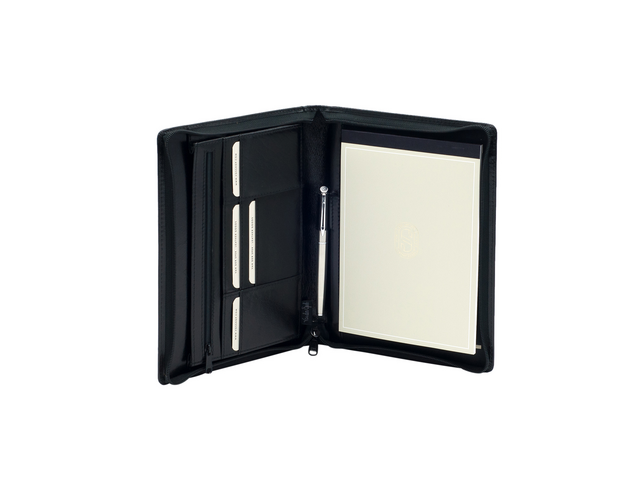 * Conférencier en cuir de buffle à fermeture éclair. * Format A5. * Pochette à soufflet sur toute la largeur. * Pochette à fermeture éclair et grande pochette d’insertion. * Quatre petites pochettes d’insertion. * Boucle-stylo et insertion pour bloc-notes.