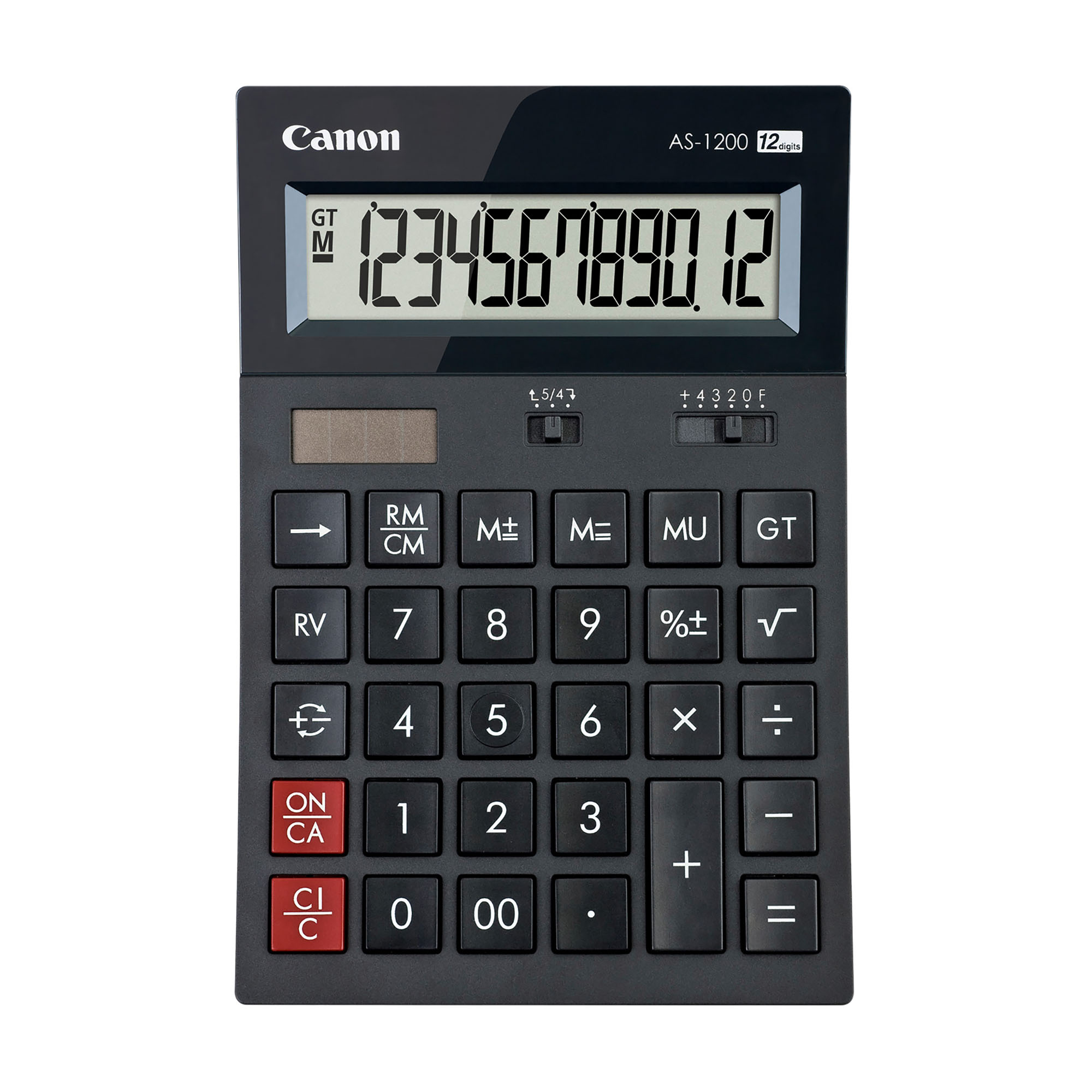 Detailled descriptionThis desktop calculator has an elegant arched design and offers many very useful functions.It also includes a dual power function, a tilted screen, and features a superb dark gray finish. 12 digitsArched designLarge tilted LCD screenDual power (solar and battery (1 LR44))Rounding and decimal selectionFunctions: Cost/Sell/Margin (MU), Reverse (RV), Grand Total (GT)Lower and upper cases made from recycled Canon materials