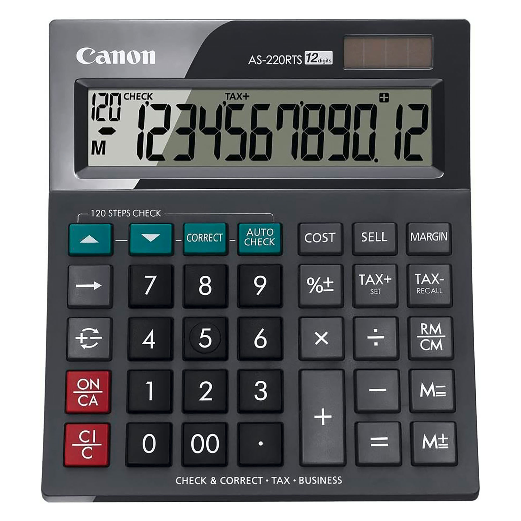 Detailled descriptionPetite calculatrice de bureau.• 12 chiffres• Ecran LCD• Double alimentation (solaire et pile)• Fonctions : Valorisation/plus-value (MU), Taux, changement du nombre de décimales• En partie fabriquée à partir de matériaux Canon recyclés