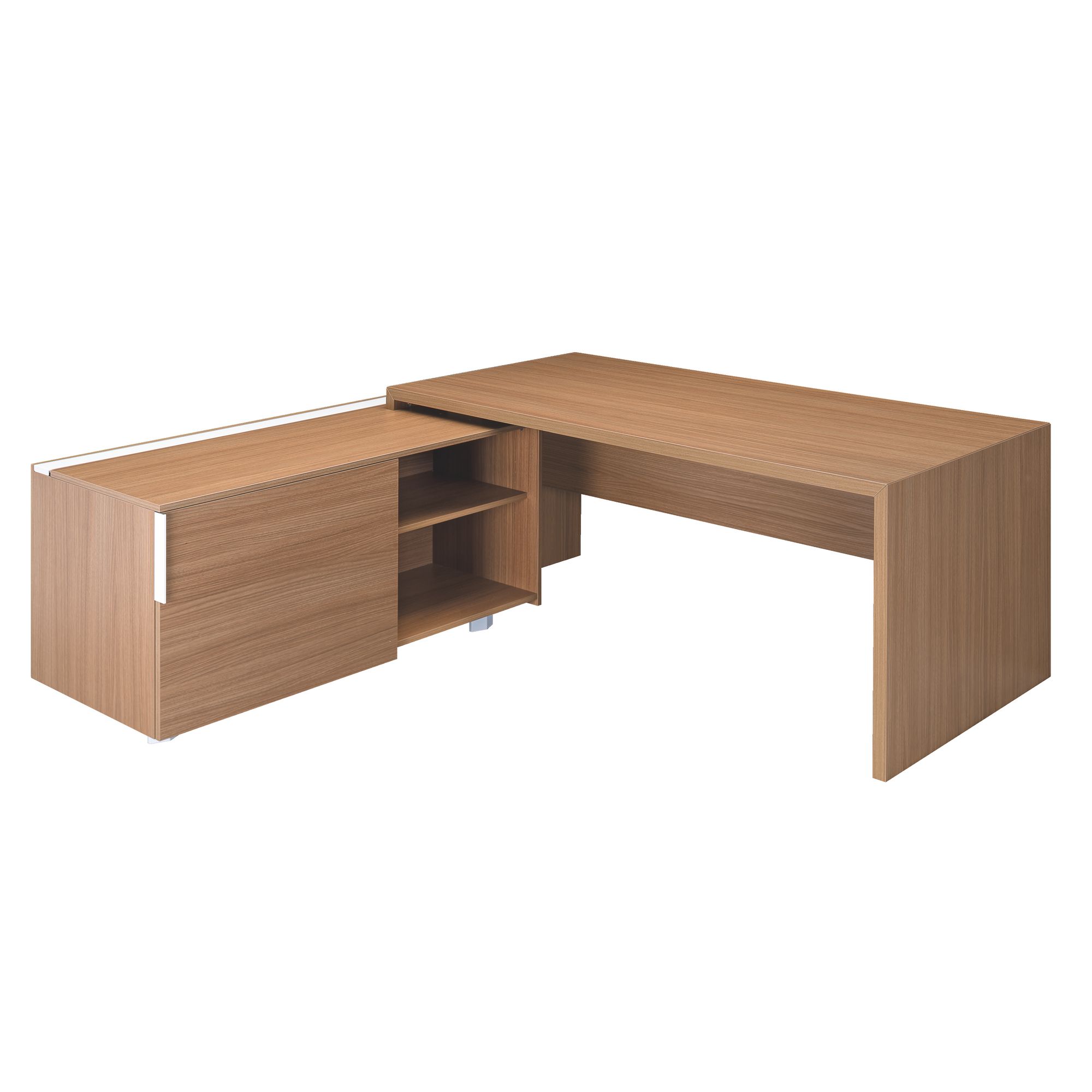 Optimize your workspace and storage with the Essenzza corner desk with return on trolley. This sturdy corner desk consists of a desk table and a return with trolley with sliding doors located on the left or right. The return provides you with a large work and filing surface.