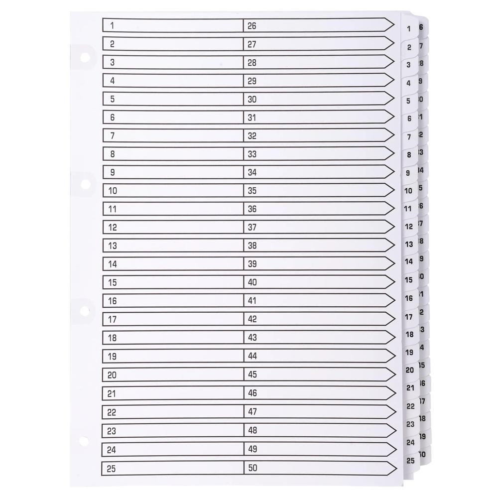 Exacompta Mylar Printed Indices, A4, 50 Part 1 to 50 The Exacompta Indices are made from 160gsm white card with white reinforced plastic tabs. The indices are A4 in size and are pre printed with 1 to 50. The indices are pre punched so they can be inserted in files and folders. Tabs printed on both sides The indices come with a printed index page for identifying contents. The indices come in 50 parts Numbered tabs 1 to 50 The Exacompta Indices are made from 160gsm white card with white reinforced plastic tabs. The indices are A4 in size and are pre printed with 1 to 50. The indices are pre punched so they can be inserted in files and folders. Tabs printed on both sides The indices come with a printed index page for identifying contents. The indices come in 50 parts Numbered tabs 1 to 50