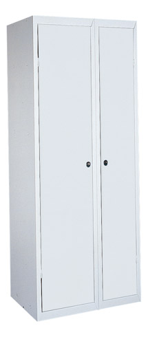 Left compartment : 3 shelves. Right compartment : 1 shelf with a bar for coathangers + 1 shelve at the top for accessories + 2 broom holders. Air holes at the back both at the top and at the bottom. Lock with 2 included keys. Everything is metal lacquered. 2 colours: grey with blue or grey. Dimensions left compartment : H 180 x W 40 x D 50 cm. Dimensions right compartment : H 180 x W 30 x D 50 cm. Total dimensions : W 70 cm. Elements need to be installed, easy assembling.