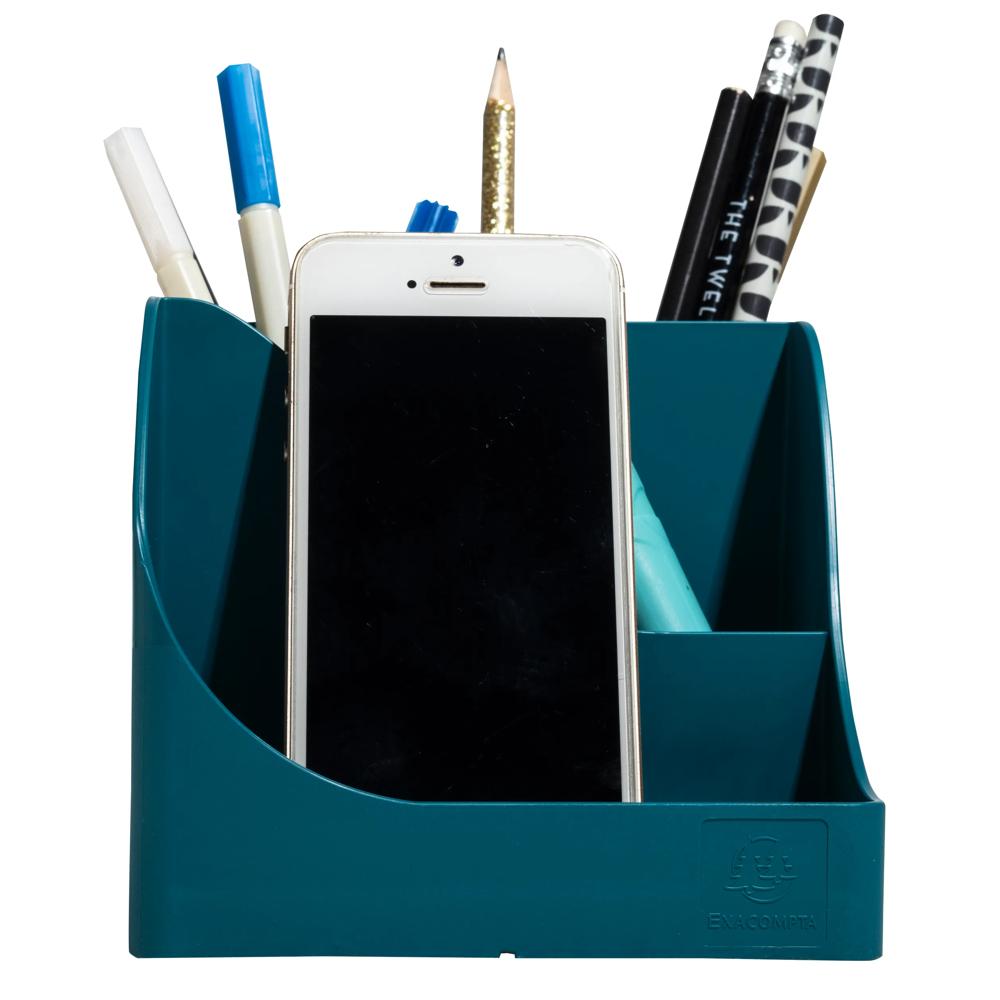 It offers 4 high compartments for large utensils: scissors, pens and 1 low compartment for small objects such as paper clips, drawing pins, USB key or even mobile phone.
