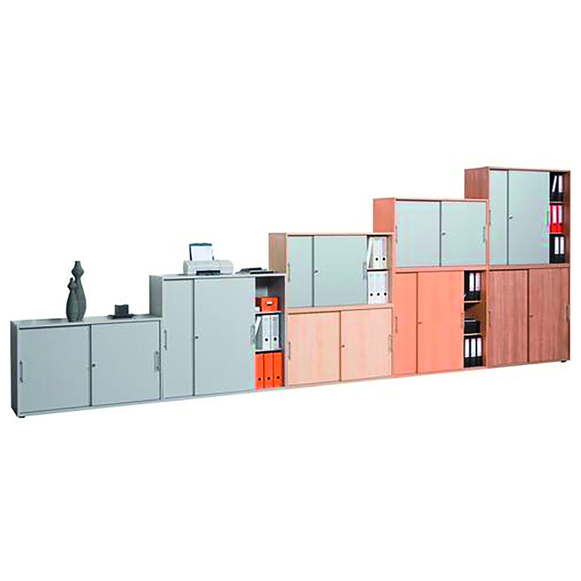 Structure: laminated chipboard (DIN 68765 - E1 category). Front side with 2 mm thick ABS protective strip. Side panels : 16 mm thick, top and lower panels: 22 mm thick. Back: 3 mm (screwed down in grooves) - silver coloured.Lock: "Slide Line" at the bottom on 2 wheels per door in rail (adjustable in height) - on top with 2 blocks per door in rail.Equipment: shelves: 16 mm thick, front side with 2 mm thick ABS protective strip. Adjustable in height every 32 mm.Dimensions: width: 120 cm, height: 74,8 cm and 110 cm (stackable combinations: 149,6 - 184,8 - 220 cm). Depth: 40 cm.Base: 5 round legs (black - H : 20 mm), on top adjustable in height through bottom.Lock: one cylinder lock for both doors (2 separate locks on demand).Handle: in silver coloured plastic, 128 mm. Carrying capacity: 25 kg/shelf.