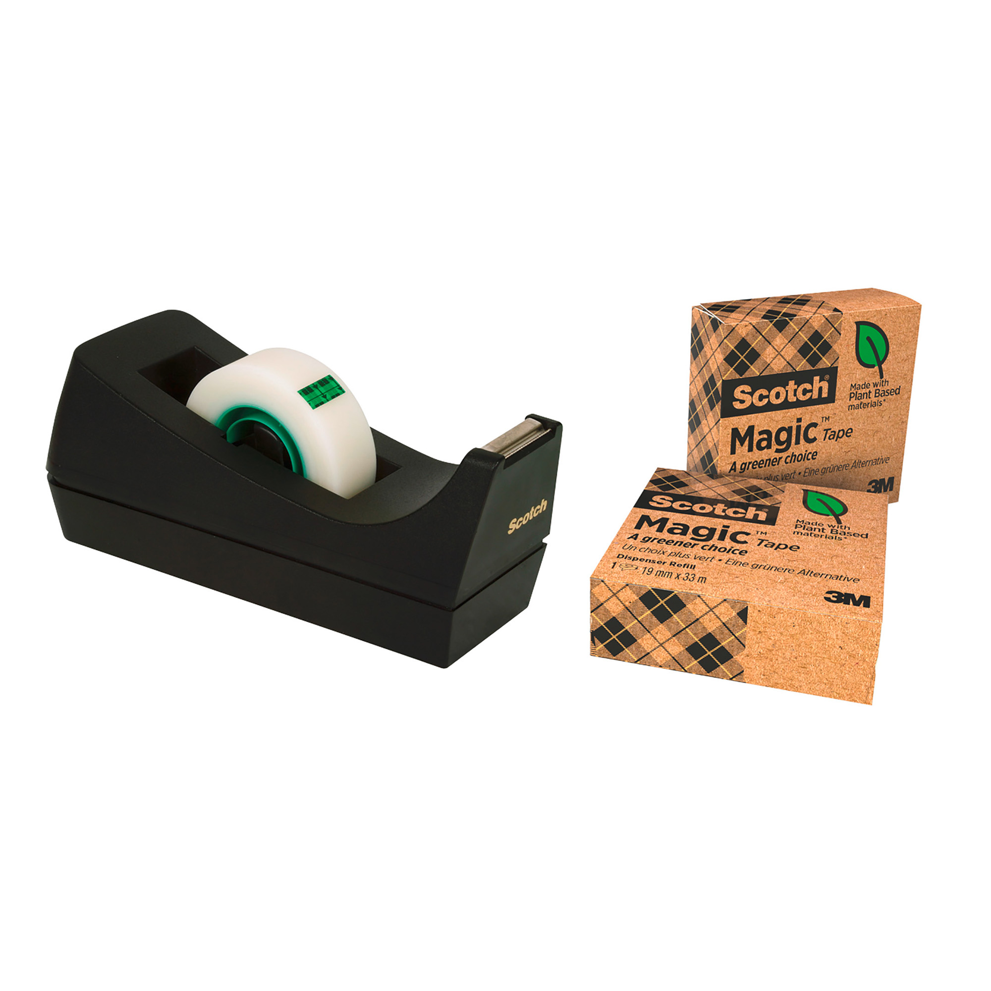 The C18 tape dispenser is a weighted tape dispenser for easily unwinding and cutting tape. Easy to refill, it can accommodate tapes up to 19 mm x 38 m on a 2.54 cm diameter core. Its Scotch invisible vegetarian adhesive tape is delivered in a recycled cardboard packaging and recycled plastic core. It is possible to write on the adhesive with a pen, pencil, or marker. It unwinds smoothly and cuts easily.