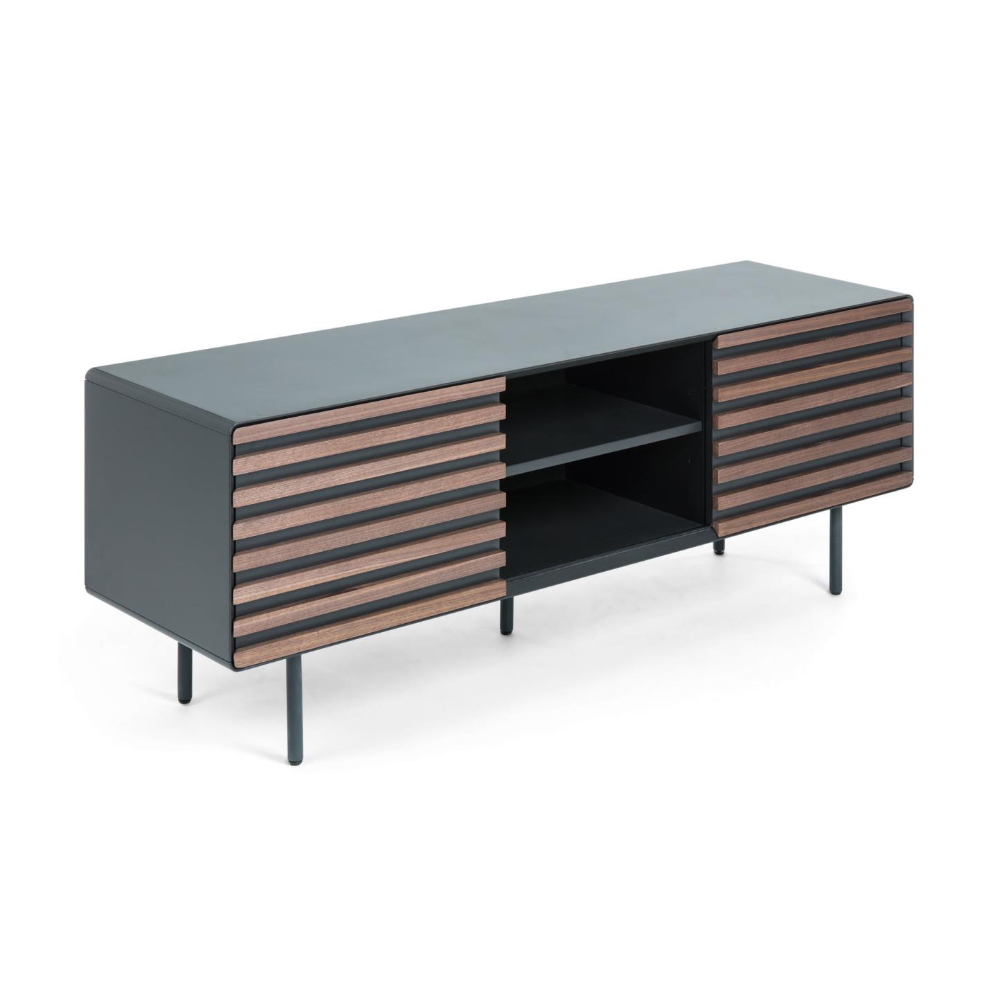 Detailled descriptionTV cabinet with MDF matt graphite lacquered structure. Front with 2 sliding doors in walnut veneer. Metal legs.