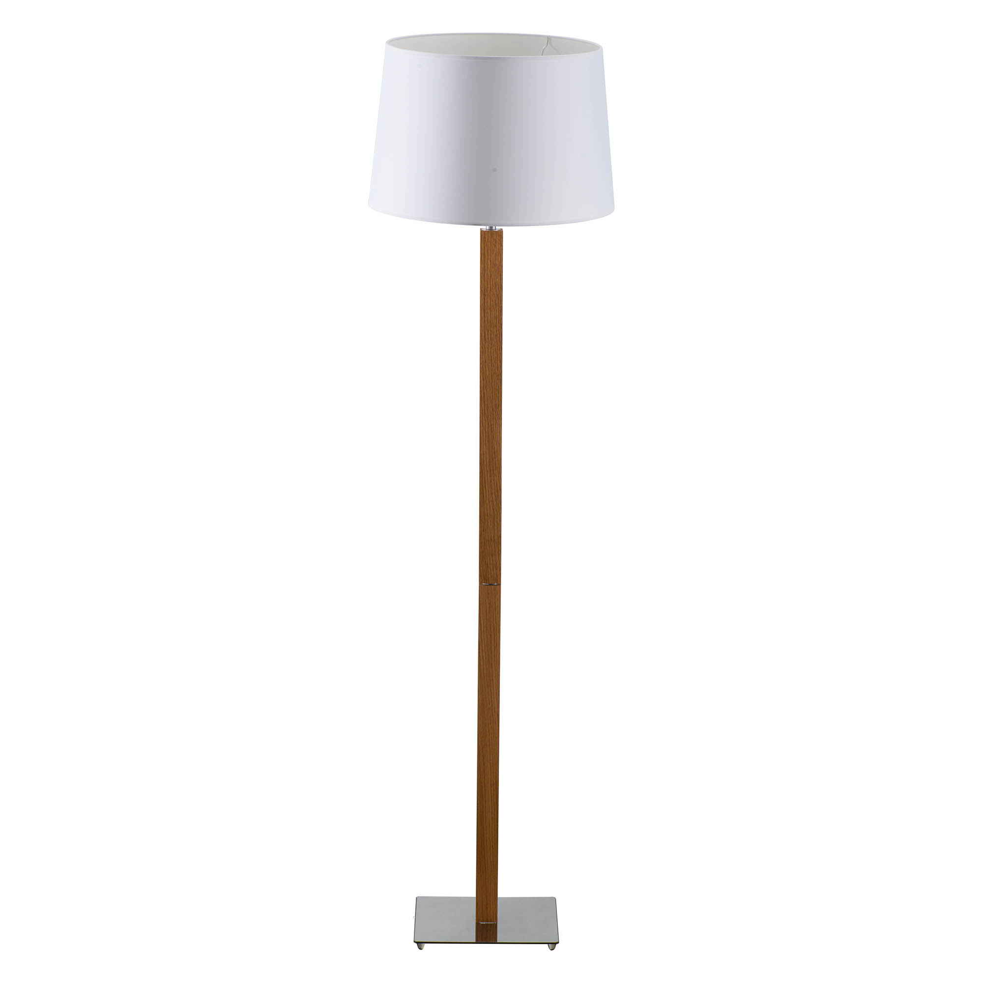 Its chromed metal base, wooden shaft, and white cotton lampshade give it a lot of elegance.